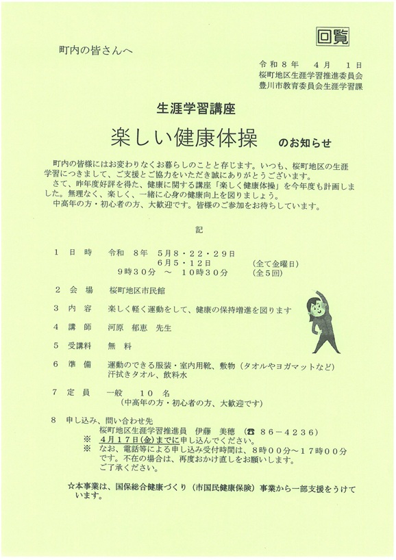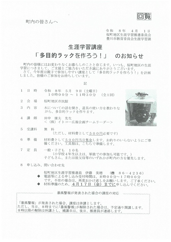 5月の講座は「楽しい健康体操」「多目的ラックを作ろう」です。詳細はサイトナビ「生涯学習講座のお知らせ」に掲載しました。